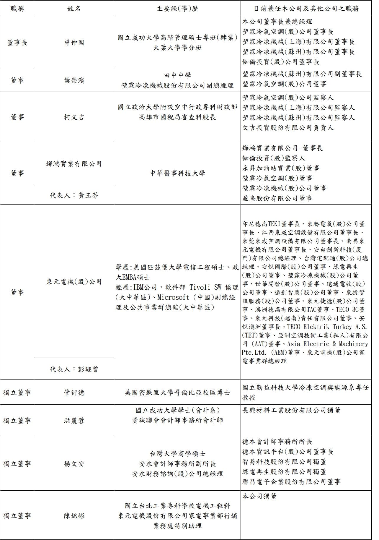 堃霖冷凍機械董事會為公司最高治理機構,董事會除為公司營運上提供策略性指導,並可監督公司管理階層之經營績效,強化公司績效與責任,以達成增加股東長期利益之目標,為股東創造最大利益。 本公司依公司章程規定,董事會設置董事9席(包含獨立董事4席),每屆任期3年,連選得連任。董事之選任依公司法第一九二條之一規定,採候選人提名制,董事候選人提名之受理方式及公告等相關事宜,依公司法、證券交易法相關法令規定辦理。 堃霖冷凍機械董事會成員如下表: