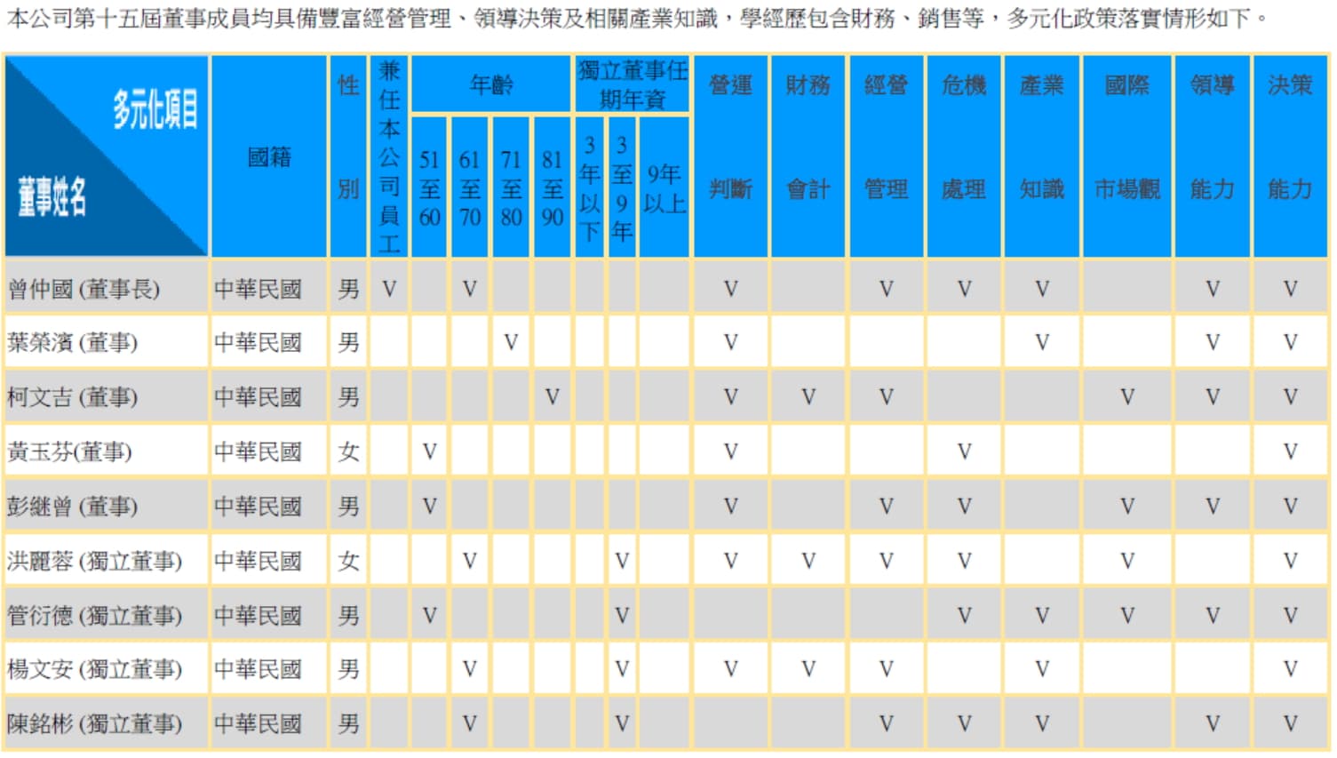 另外,董事會成員包含2名女性董事(占比為22%);4名獨立董事(占比為44%,其中有3名獨立董事任期年資在6年以下,1名獨立董事任期年資在6~9年)以及法人董事2名(占比為22%)。